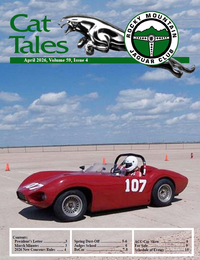 Welcome to Rocky Mountain Jaguar Club! In its 57th year! The Rocky Mountain Jaguar Club serves Jaguar enthusiasts from Colorado, Wyoming, Nebraska, and several other states. Our 126 members love to share their common interest in all things Jaguar. Parties and monthly meetings are well attended and quite lively. We are an affiliate of the JCNA, Jaguar Clubs of North America. Our sister clubs, Jaguar Club of Southern Colorado and Jaguar Club of New Mexico are also active and our newsletter, Cat Tales, features Concours and other events sponsored by RMJC, JCSC and JCNM. To join our club, click here. To see our current schedule of events, click here. Tom Estes, President, Rocky Mountain Jaguar Club